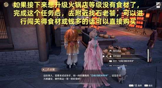 如果后续升级火锅店,食材不够用了,可以去附近找石老饕,完成这个任务后,会解锁大喵闯关和购买食材的选项