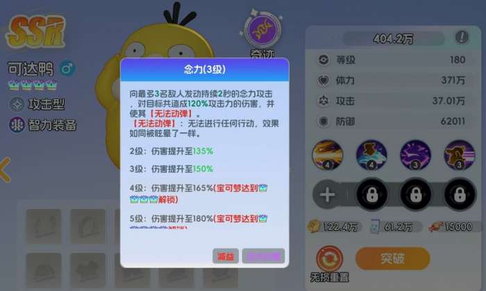 当可达鸭来到11级时,第二个技能冲浪也将解锁,释放时除了能对周边敌人造成伤害外,还会附带击退效果,令它们远离可达鸭。而且一旦有近战敌人攻击到可达鸭,还有40%概率能让可达鸭清除冲浪的CD并再次释放。41级时更会令可达鸭解锁一个很好用的控制技能念力,可达鸭能利用该技能对至多3名敌人施加无法动弹效果,令它们彻底定在原地,只能被动接受己方宝可梦的攻击,没办法还手。配合上61级解锁的被动悠然自如,可达鸭会在战斗时频繁地为敌人施加无法动弹效果,将战局主动权掌握在己方手里。