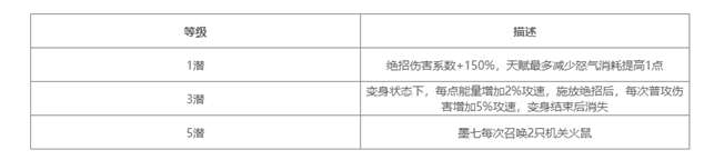 技能描述:组装巨型机关兽,在指定位置落下,对300范围内敌人,造成400%攻击力的内劲伤害;墨七驾驶机关兽作战,普攻切换为近战,攻击和防御提高60%,持续20秒;绝招施放时,献祭我方场上所有召唤物,每献祭1个召唤物,增加1点能量;变身状态下,每点能量,攻击增加5%,绝招伤害系数增加20%,整场有效,上限20点。