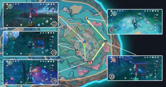 ◆图示位置山顶的三个螺帽章鱼解谜。利用乐章技能螺帽章鱼位置,使三个章鱼同时激活附近的音乐花,即可完成解谜并出现宝箱。
