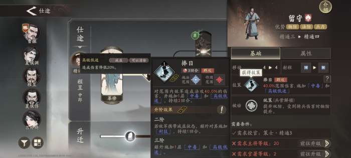 程昱的两条职业线,个人推荐走上路,上路的攻击范围为自身九宫格属于偏近战,而下路的攻击范围是八向2格且不会近战攻击,上线血防较高,下线法攻较高但比较脆,由于程昱是debuff型法师,本身伤害不是很高,因此我们需要程昱能站得住脚,利用他的技能持续为敌方带来减益效果,再加上核心技能1会用双抗代替法攻造成伤害,因此需要保证一下程昱的肉度。