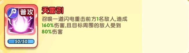 召唤一道闪电重击前方1名敌人造成160%伤害,且目标周围的敌人受到80%伤害