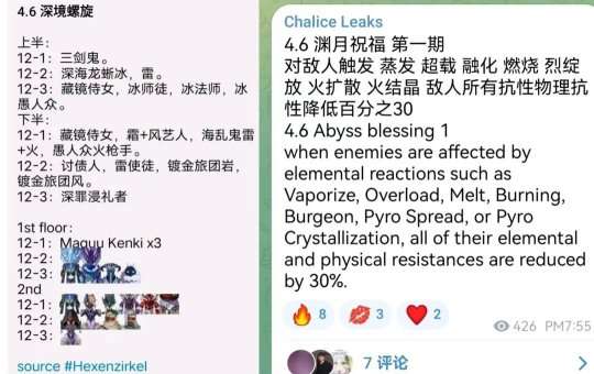 除此之外,4.6版本深渊的情况也来了,在4.6渊月祝福中,对敌人触发蒸发、超载、融化、燃烧、烈绽放、火扩散、火结晶的反应时,敌人所有的抗性物理抗性会降低30%,这么来看的话,4.6版本的深渊还是非常利好火队的,除了新角色仆人外,胡桃看样子也要起飞了。