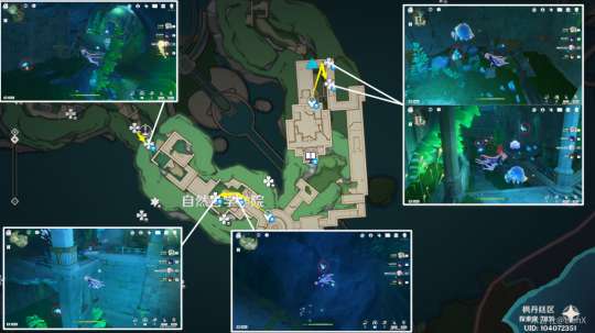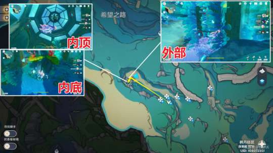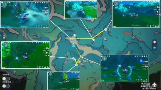 水下城墟外围区域,从下图中的传送点进入外围区域,先按黄色箭头路线(三个点),然后再按橙色箭头走(三个点)。