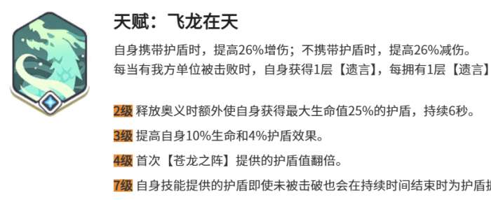 青龙的核心战斗力就来自于天赋飞龙在天,在携带护盾时就会有26%的增伤加成。因此就会让角色拥有一种略不可挡的优势,在没有护盾时26的减伤效果又能让角色稳如泰山。随着占有陨落积累的层数,就能让这一份加成持续的攀升,每一层都会承载着并肩作战的信念。七级解锁的护盾获得额外的收益,另外还会有被击破时的物理防护增防,让他在攻防之间就能找到完美的平衡。技能体系的协同,也能让青龙拥有更多的优势,奥义技能在18秒的冷却周期。就会有范围击飞的效果,可以先手开团,还能够收割残敌。