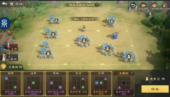 阵法首选天覆阵,释放技能后概率治疗自身部队,搭配许褚的被动效果(华佗一般都是配许褚,组生存盾),可更好的维持全队兵力稳定。如果没有天覆盾,可暂用长蛇阵代替。