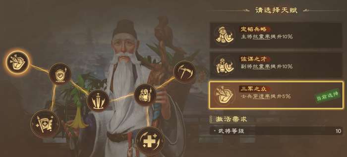 推荐路线:三军之众(提升穿透)→整旅厉卒(提升盾兵生命)→奇行之阵(携带生存阵法,提升恢复)→强而避之(提升技能抗性)→实而备之(提升普攻伤害抗性)→八方来援(提升治疗效果)→50级天赋(基于需求选择)