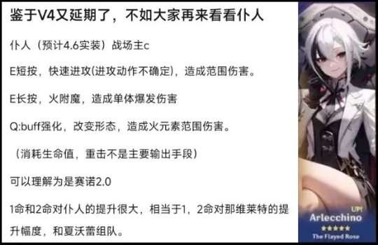 根据舅舅们爆料的最新消息来看,仆人会在4.6卡池实装,定位是站场主C,E技能长按的情况下,可以进行火附魔,并造成单体爆发伤害,大招可以改变形态,同时得到BUFF强化,会消耗生命值,而重击也并不是仆人的主要输出手段,看样子和大胡桃是无缘了,倒是可以理解为火赛诺,仆人的1命和2命的提升很大,具体可以对标那维莱特,需要和夏沃蕾组队,据说强度堪比那维,不过这负二命属实让人难崩。