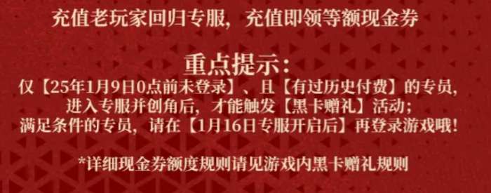 黑卡赠礼的参与条件有两个。第一个是账号最后登录时间必须在2025年1月9日零点之前,第二个是账号有过充值记录。同时满足这两个条件的玩家,在1月16日庆典专服开启之后去创建新角色,登录进去就会自动触发这个活动。这里要提醒一下,一定要等专服开了再去,不要提前登录老服,免得影响活动的判定。