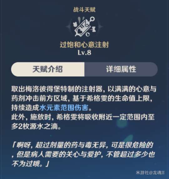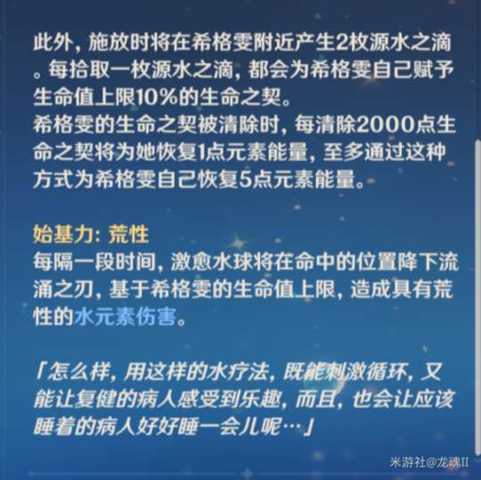 源水之滴:提升奶量的,与龙王并无关系。因为龙王自身的输出已经很强,已经有饱和的配轴buff,再加上额外的输出都没有buff的话肯定是亏的。而且,2个源水之滴也不足以完成一次蓄力攻击。总的来说,龙王并不需要这2个源水之滴。